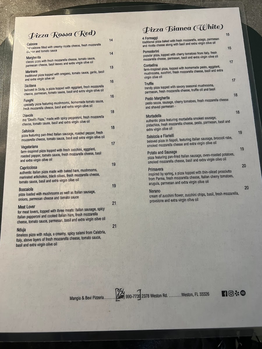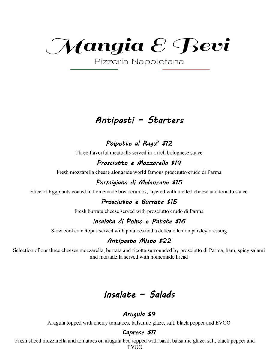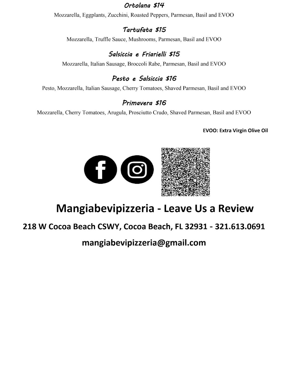 Welcome to Mangia & Bevi Pizzeria Napoletana, where authenticity meets culinary artistry right in Cocoa Beach. The menu is a delightful homage to traditional Neapolitan cuisine, featuring fresh, high-quality ingredients that burst with flavor.
